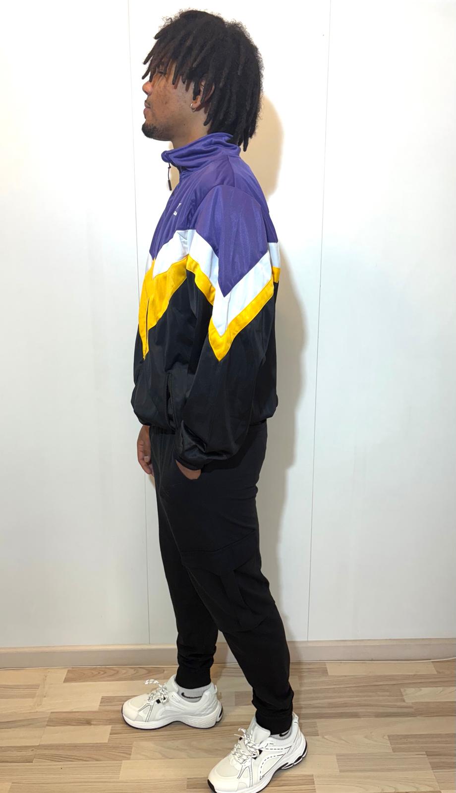 El diseño presenta un patrón geométrico en bloques de color (morado, blanco, amarillo y negro) que aporta un estilo distintivo de inspiración retro. Incorpora cremallera central completa, cuello alto, y ajustes elásticos en puños y cintura para mejorar la sujeción y el confort durante el movimiento.