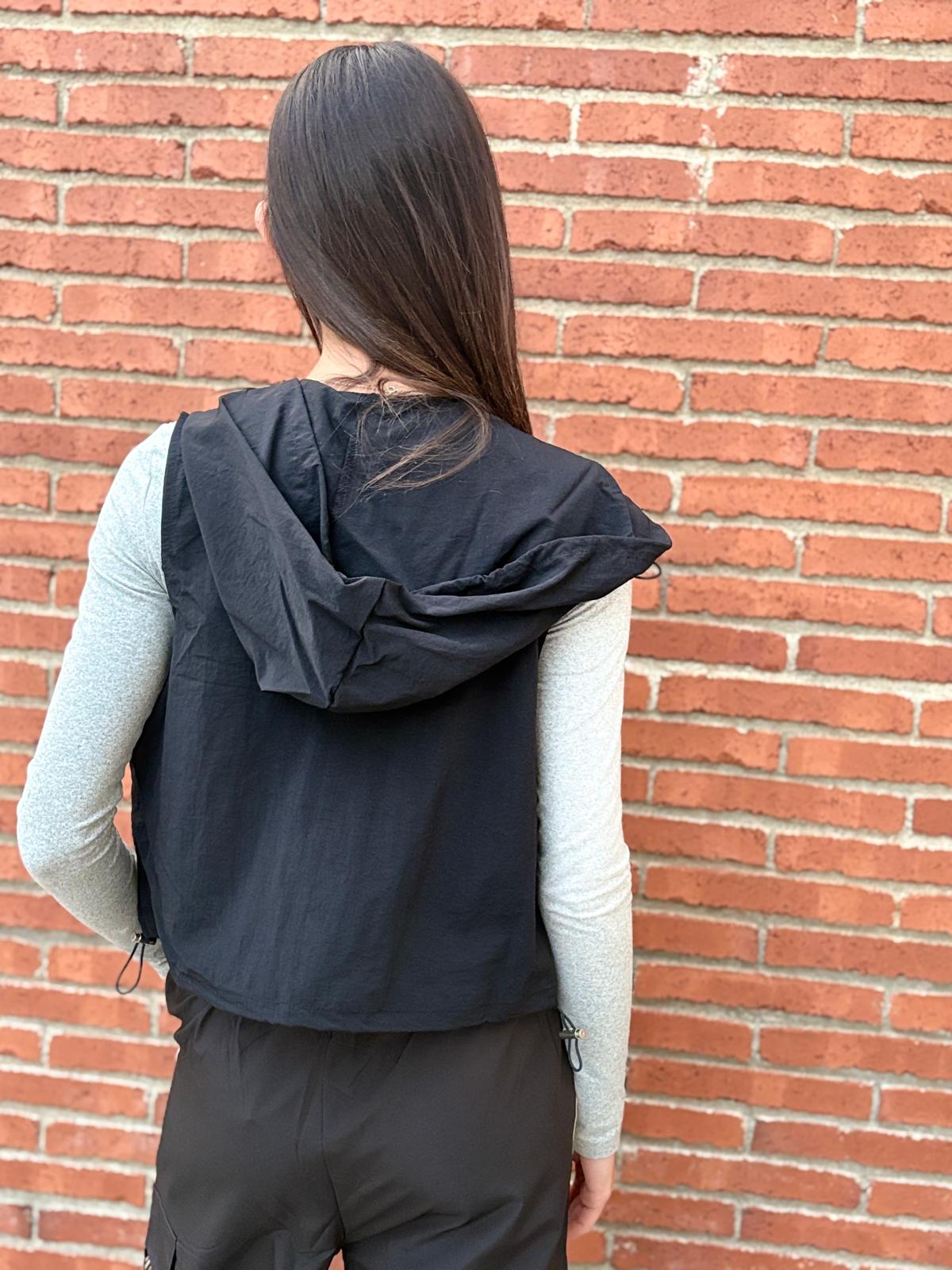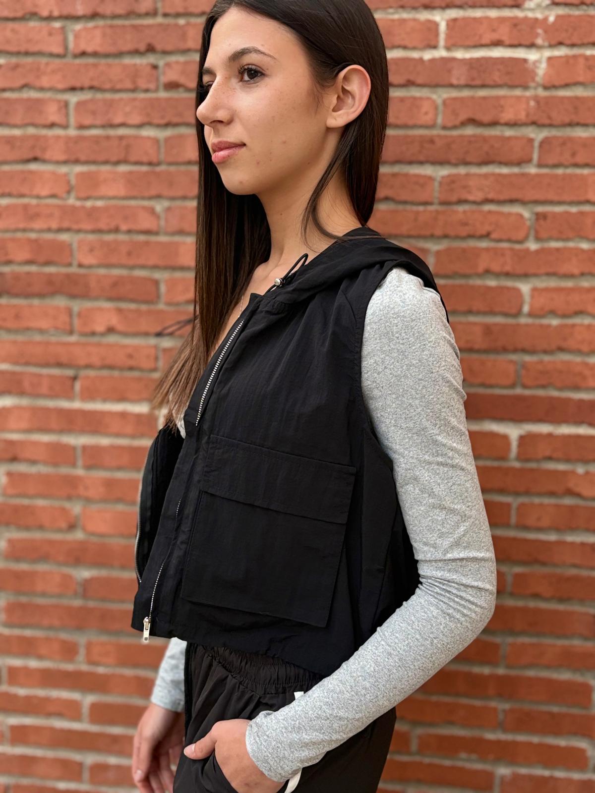 Aporta un toque moderno y versátil a tu look con este chaleco negro con capucha, una prenda ideal para entretiempo y para crear combinaciones casuales con estilo.
