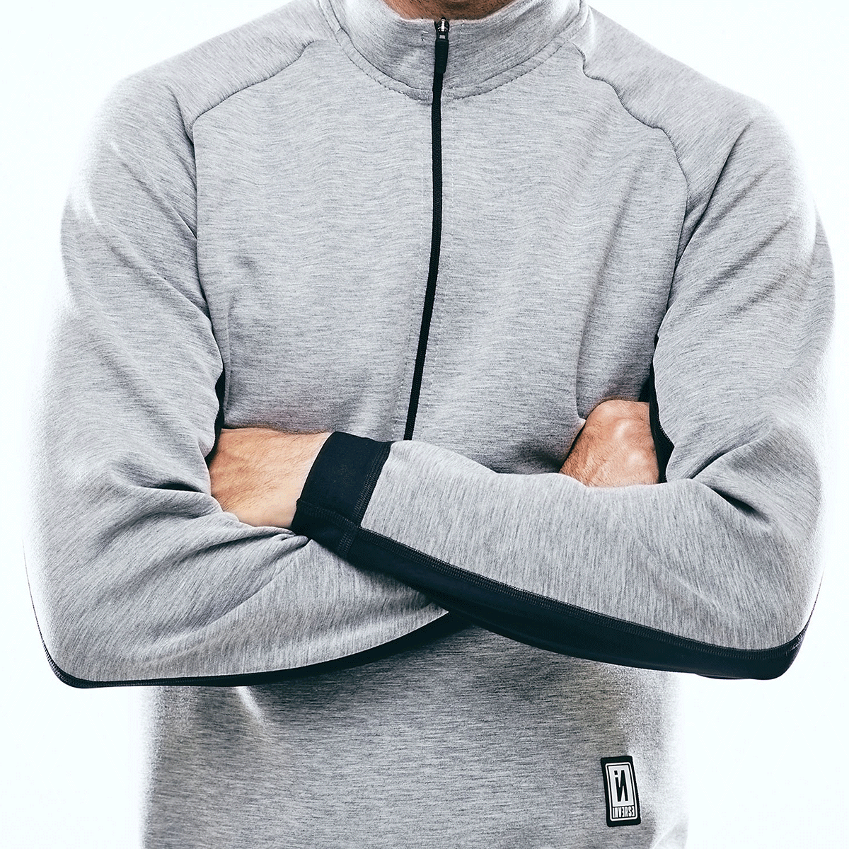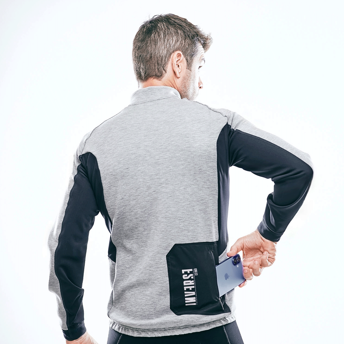 Maillot para hombre con corte relaxed fit. Una prenda versátil, ideal tanto para usar sobre la bicicleta como fuera de ella. Confeccionado con tejido SCUBA con efecto neopreno jaspeado de color gris. Las zonas bajo las mangas y las axilas están elaboradas con tejido térmico SUPERROUBAIX. Cuenta con una cremallera corta en la zona pectoral con sistema antipull, debajo de la cual se incluye una camiseta interior con ribete elástico y un acabado termorregulador HeiQ Smart Temp™. Esta pieza cubre únicamente la zona pecoral.