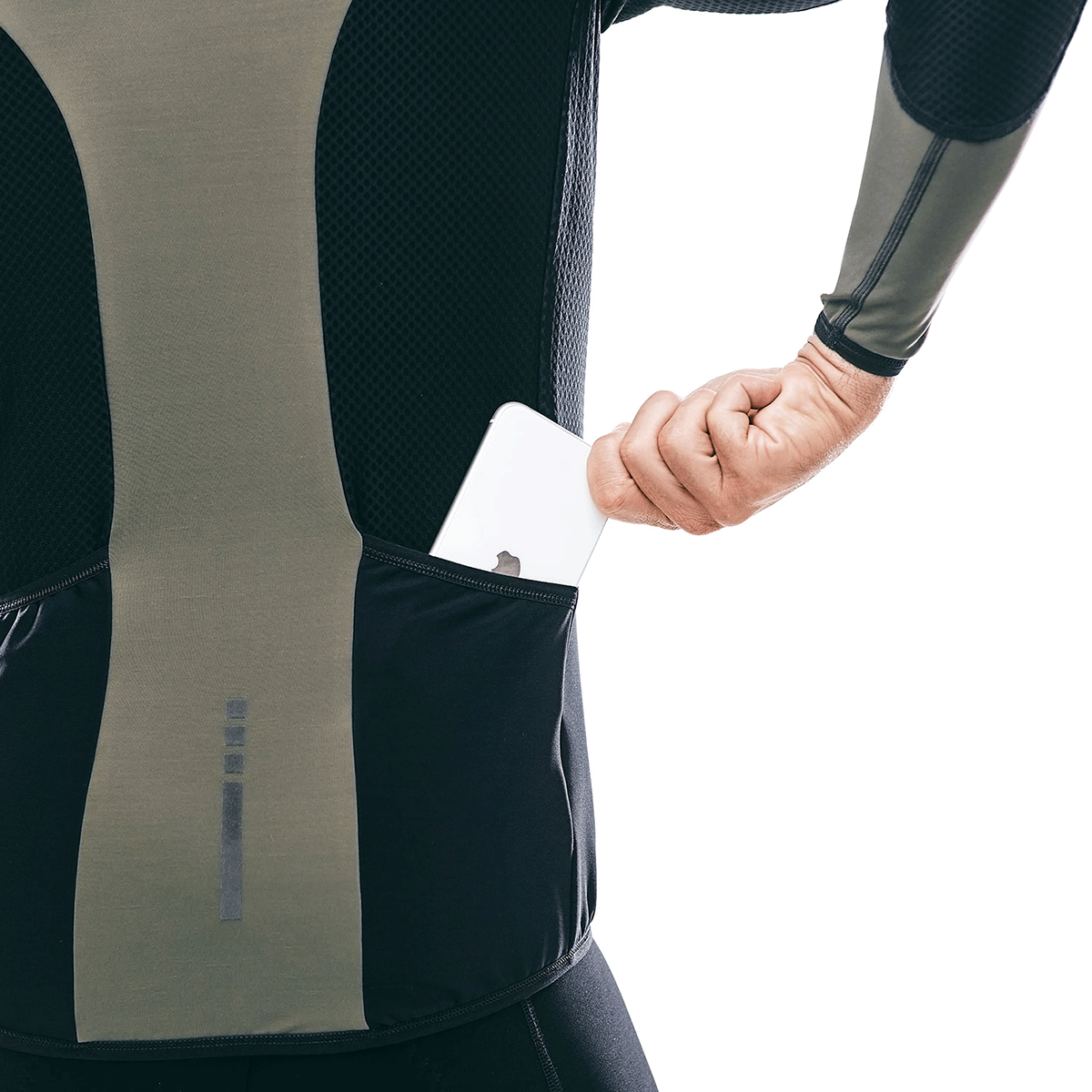 Dispone de dos bolsillos traseros con ribete elástico y silicona interior, un bolsillo lateral de tejido mesh con el mismo acabado, y un bolsillo adicional de mesh en el pecho, con ribete elástico y de fácil acceso.