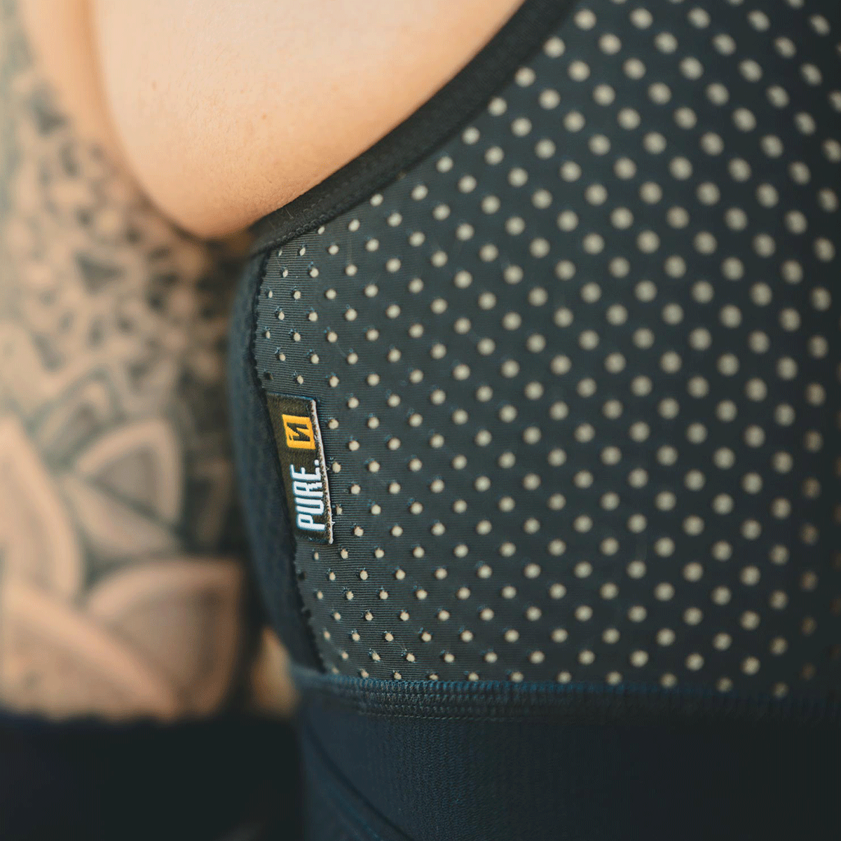 La parte frontal y laterales están confeccionados con tejido CYCLON, muy suave y elástico. En la zona de la espalda se ha añadido una pieza de tejido perforado para una mejor evacuación del sudor. Así tu piel se mantendrá siempre fresca y seca.